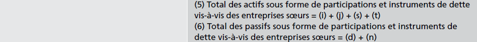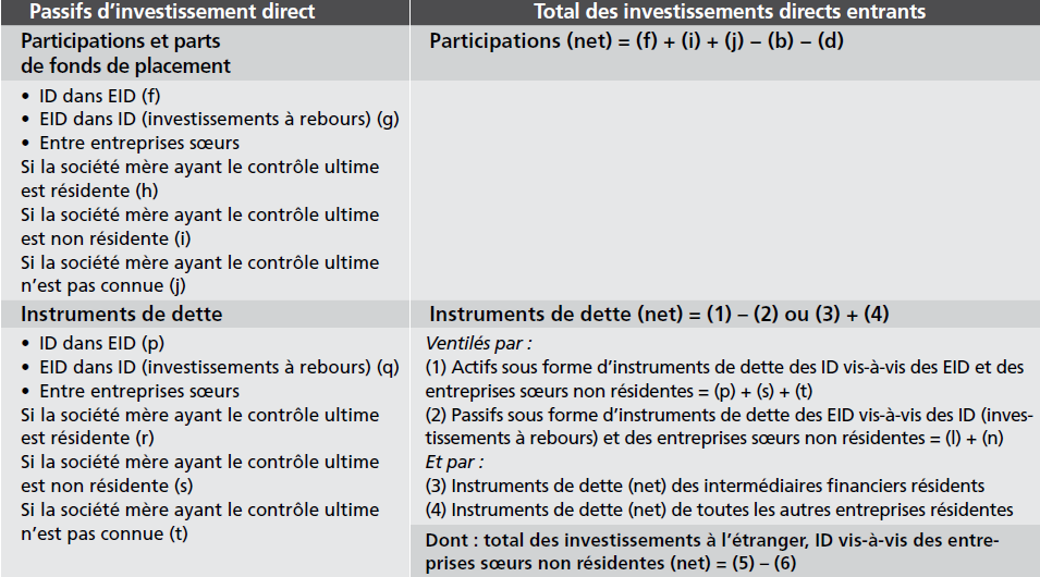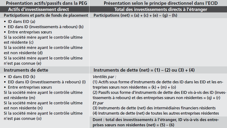 Les données sur les investissements directs de l'étranger et à l'étranger recueillies à l'aide de l'ECID doivent être conformes avec celles établies sur les investissements directs relevant de la PEG. Les deux ensembles de données sont conformes au cadre statistique des investissements directs établi dans le Manuel de la balance des paiements et la position extérieure globale (MBP6) et ils incluent l'un et l'autre que les données sur les positions. Les données sur les investissements directs sont établies sur la base des actifs et des passifs dans la PEG et selon le principe directionnel dans l'ECID, comme décrit ci-dessous (page 48 du guide de l'ECID).
