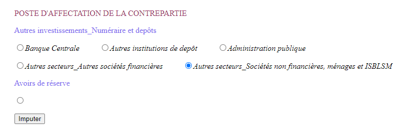Le principe fondamentale de l'Application MBP6 est que toute transaction a une contrepartie. Cela signifie que l'enregistrement d'une transaction doit être suivie de celui de sa contrepartie. En conséquence l'Application est dotée de contrôle de l'ensemble des transactions pour assurer l'écriture en partie double. Dans ce cadre, l'application MBP6 vous oblige à indiquer le poste d'affectation de la contrepartie identifiée comme ci-après :