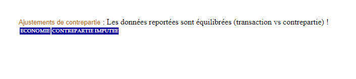 Au cas où vos enregistrements respecte le principe de la partie double, l'Application MBP6 vous indique que vos données sont équilibrées. Dans le cas contraire, l'Application MBP6 génère la congtrepartie identifiée par économie ou pays partenaire.