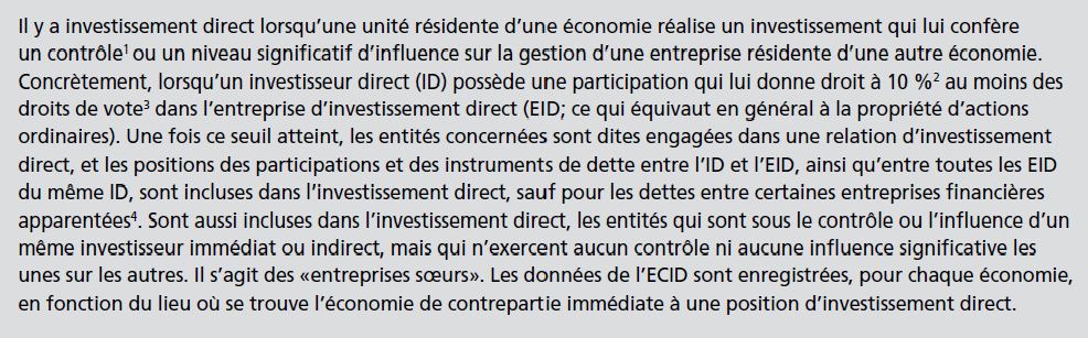 Cette application repose sur le cadre statistique des investissements directs établi dans le Manuel de la balance des paiements et la position extérieure globale (MBP6) et le guide de l'Enquête Coordonnée sur les Investissements Directs (ECID). Selon le guide de l'ECID (page 7),
